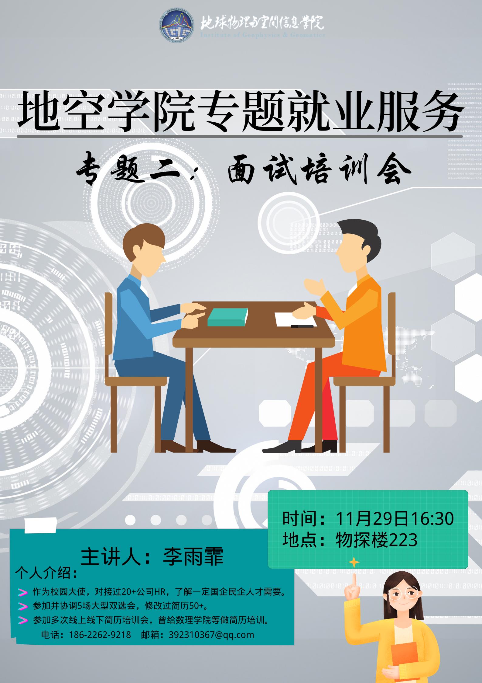 2021年11月29日下午16:00,伟德bv1946专题面试技巧就业服务第于物探楼223顺利进行。本次就业服务邀请到了就业办讲师团的李雨霏同学,李雨霏同学对接过多个公司HR,对各企业人才需求有一定了解,多次参加各学院就业服务工作,经验丰富,能力突出。